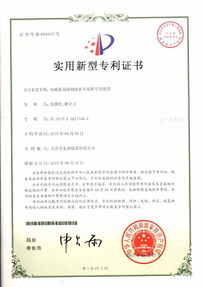雙通道雙堵劑油水井堵漏專(zhuān)用裝置